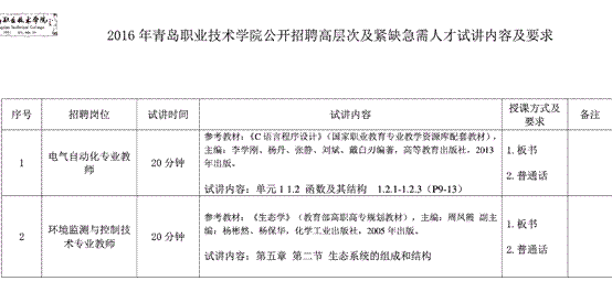 2016年12月山东青岛职业技术学院招聘高层次及紧缺急需人才试讲内容及要求