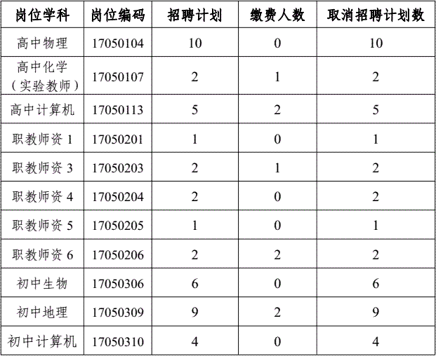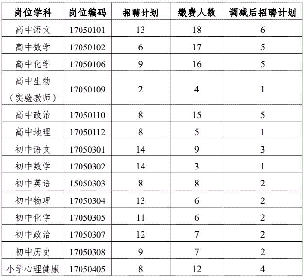 通江县2017年上半年公开考试招聘中小学教师和特教教师网上报名缴费工作已经结束,根据各岗位报名缴费情况,按照通江县人力资源和社会保障局、通江县教育科技体育局《关于2017年上半年公开考试招聘中小学教师和特教教师的公告》相关规定,现对取消和调减部分岗位招聘计划情况公告如下:
