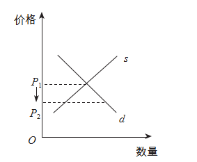 在供需平衡的某商品市场上,假设政府基于某种目标,决定对该商品实施价格上限管制政策,其他条件不变。下图(P1 表示政策实施前价格,P2 表示政策实施后价格) 中能反映该政策实施后价格变动的是(? )。