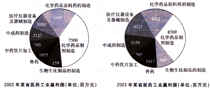 - 2与2002年相比,2003年医药制造业中哪个行业的盈利增长得最快?()