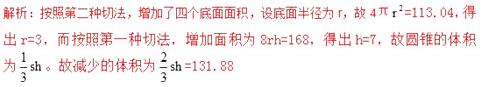写作题 若将一个圆柱体木块过轴切成四块,表面积增加168平方厘米,若与上下底面平行将它切成三块,表面积增加113.04平方厘米。求将它削成最大的圆锥体,体积减少多少立方厘米?(π的值为3.14)