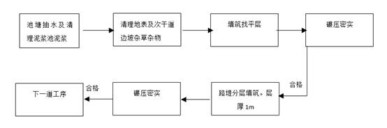 (2)引道路堤在挡土墙及桥台施工完成后进行,路基用合格的土方从现有城市次干道倾倒入路基后用机械摊铺碾压成型,施工工艺流程图如下: