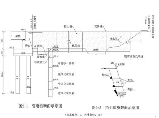 某公司承担的市政桥梁工程中,桥梁引道与现有城市次干道呈T型平面交叉,次干道边坡坡率1:2、采用植草防护:引道位于种植滩地,线位上现存池塘一处(长15m,宽12m,深1.5m);引道两侧边坡采用挡土墙支护;桥台采用重力式桥台。基础为120cm混凝土钻孔灌注桩。引道纵断面如图2-1所示。挡土墙横截面如图2-2所示。