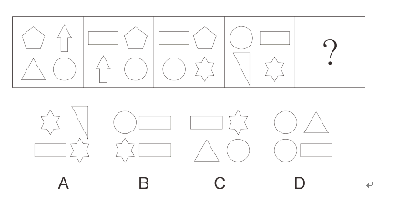 请认真观察每组图形,理解其中含义,判断出它的逻辑和顺序,并在四个选项中选择最正确的答案。(共5题,每题0.9分,共计4.5分)