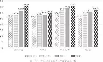 一是全国两化融和发展总指数持续增长。2011~2014年,我国两化融合发展总指数分别为52.73、59.07、61.95、66.14, 2014年增幅比2013年增幅扩大。