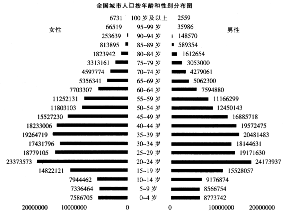 根据2010年第6次人口普查数据显示,男性城市人口总数为2.06亿,女性城市人口总数为1.97亿。其年龄段分布如下图所示: