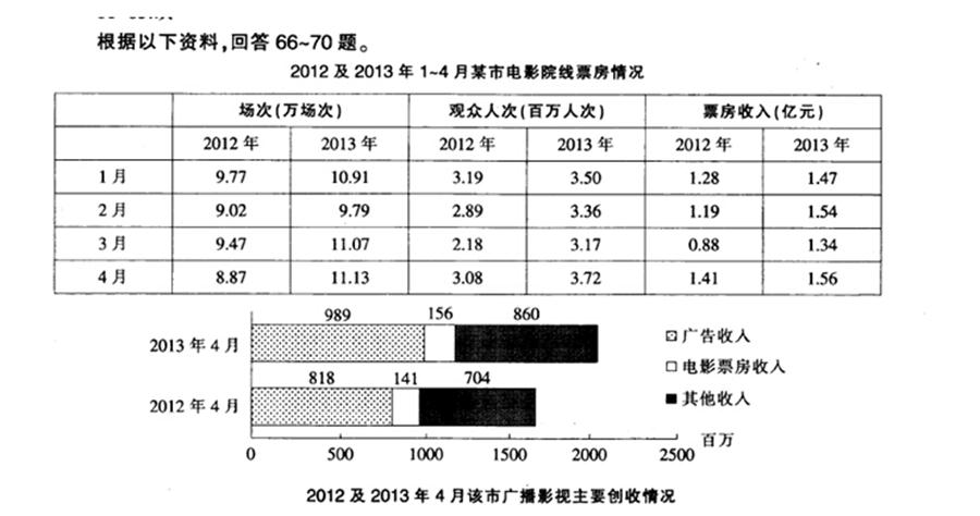 · (61). 2013年1~4月,该市电影院线票房收人同比增量从高到低排序正确的是( )。
