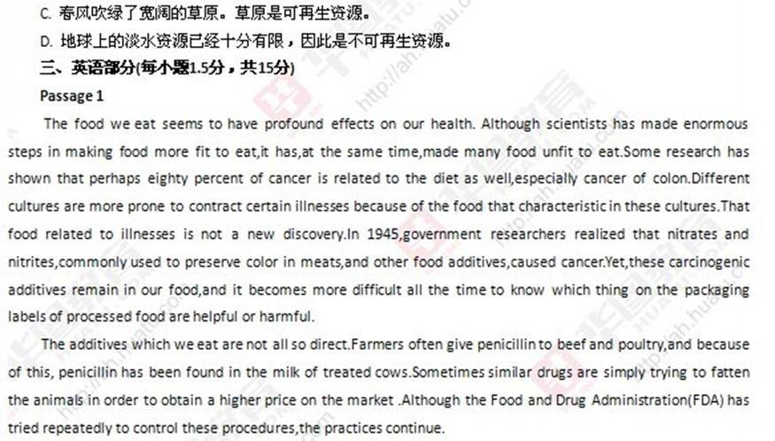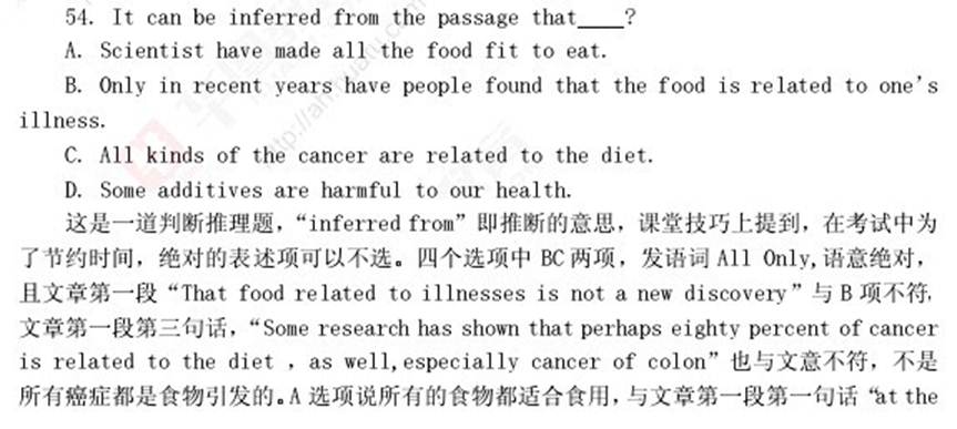 The food we eat seems to have profound effects on our health. Although scientists has made enormous steps in making food more fit to eat,it has,at the same time,made many food unfit to eat.Some research has shown that perhaps eighty percent of cancer is related to the diet as well,especially cancer of colon.Different cultures are more prone to contract certain illnesses because of the food that characteristic in these cultures.That food related to illnesses is not a new discovery.In 1945,government researchers realized that nitrates and nitrites,commonly used to preserve color in meats,and other food additives,caused cancer.Yet,these carcinogenic additives remain in our food,and it becomes more difficult all the time to know which thing on the packaging labels of processed food are helpful or harmful.