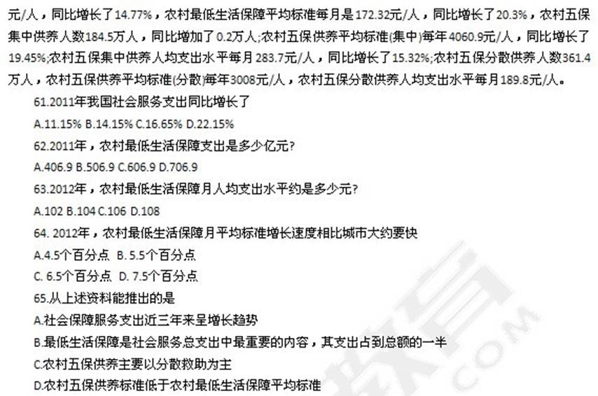 64.选B。从第二段的第三句话可以看出,农村最低生活保障月平均保准增速为20.3%,