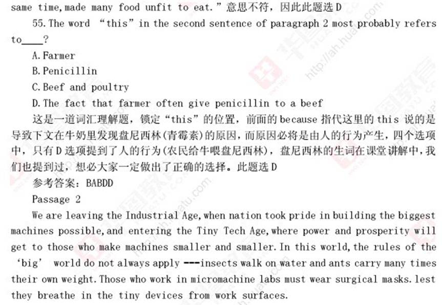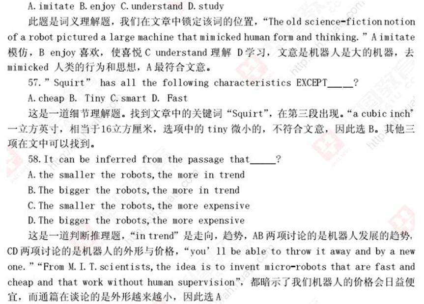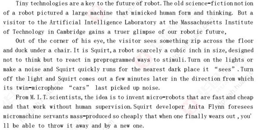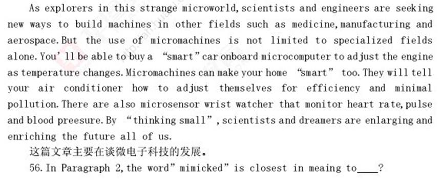 这是一道主旨概括题。观察选项,四个选项都提到了关键词“micromachines”,关键是前面的动词。A describe形容了微型机器如何制造的,B介绍了微型机器的应用,C促进了微型机器的发展D讨论了微型机器的优势和劣势。从文段中看,文章主要在谈微型机器的发展,选择C选项
