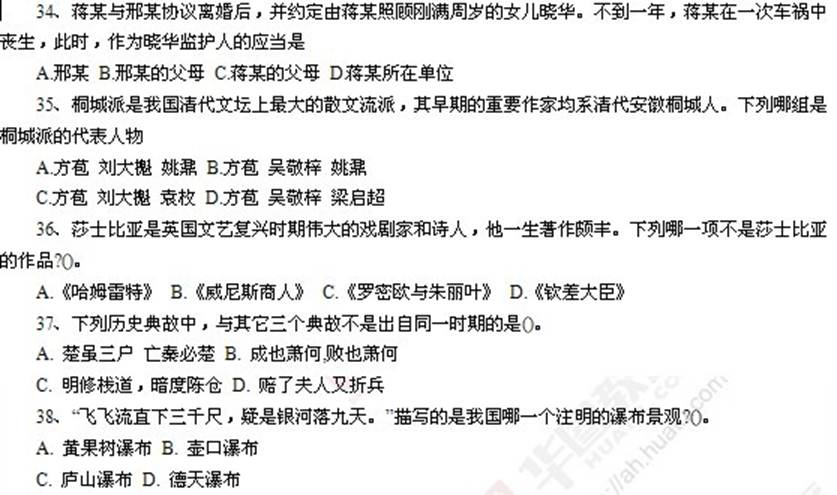 34.【解析】:答案是A。蒋某和邢某虽然协议离婚,但都是晓华的法定监护人,所以当蒋某丧生后,晓华的监护人就应该是邢某。