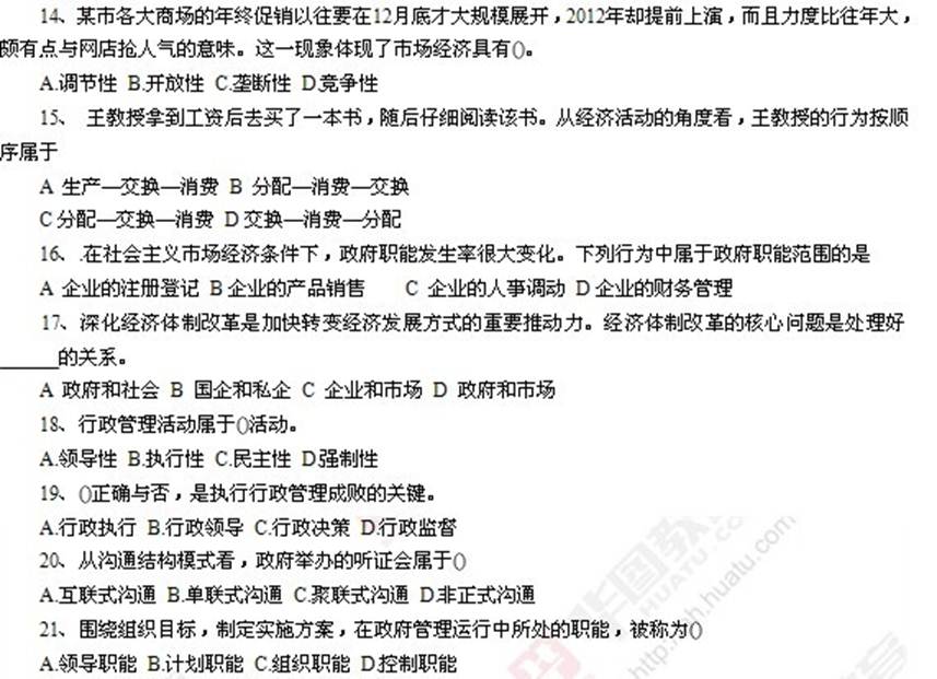 18.【解析】:答案是A。行政是国家权力机关的执行机关(即国家行政机关)行使国家权力,依法管理国家事务、社会公共事务和行政机关内部事务钓活动。行政管理活动具有执行性、政治性、权威性的特点。