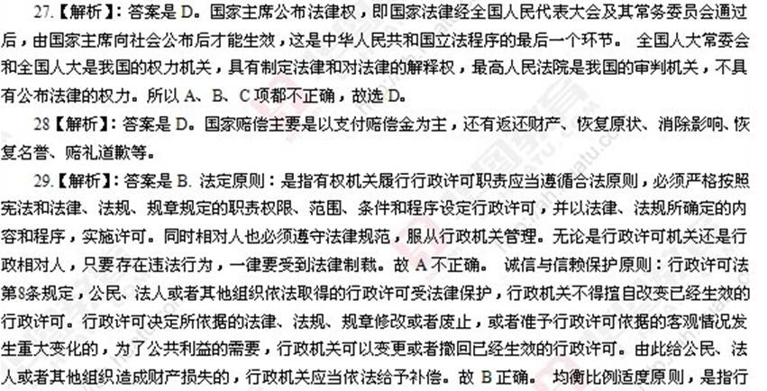 14.【解析】:答案是B. 法定原则:是指有权机关履行行政许可职责应当遵循合法原则,必须严格按照宪法和法律、法规、规章规定的职责权限、范围、条件和程序设定行政许可,并以法律、法规所确定的内容和程序,实施许可。同时相对人也必须遵守法律规范,服从行政机关管理。无论是行政许可机关还是行政相对人,只要存在违法行为,一律要受到法律制裁。故A不正确。 诚信与信赖保护原则:行政许可法第8条规定,公民、法人或者其他组织依法取得的行政许可受法律保护,行政机关不得擅自改变已经生效的行政许可。行政许可决定所依据的法律、法规、规章修改或者废止,或者准予行政许可依据的客观情况发生重大变化的,为了公共利益的需要,行政机关可以变更或者撤回已经生效的行政许可。由此给公民、法人或者其他组织造成财产损失的,行政机关应当依法给予补偿。故B正确。 均衡比例适度原则,是指行政主体所采取的为达成行政目的所必要的手段,不能给相对人权益带来超过行政目的之价值的侵害,即行政手段对相对人权益的损害必须小于该行政目的所实现的社会公共利益,不能超过这一限度。故C不正确公开、公平和公正原则:(1)公开。行政许可法明确规定,规范行政许可的规范性文件必须公开,未经公布的规范性文件不得作为实施行政许可的依据;行政许可的事项、范围和条件应当公开,行政许可的过程应当公开。(2)公平、公正。即在设定和实施行政许可过程中,应当公平、公正,不得给予一些人特权或者给予一些人轻视,同样条件和情况必须同样对待。故D不对。
