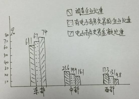 分东、中、西部地区看,有电子商务活动的企业分别为15118家,4496家和2959家,电子商务交易额分别是21341.6亿元,4653。7亿元,2829.9比上年分别增长了19.5%和17.6%。