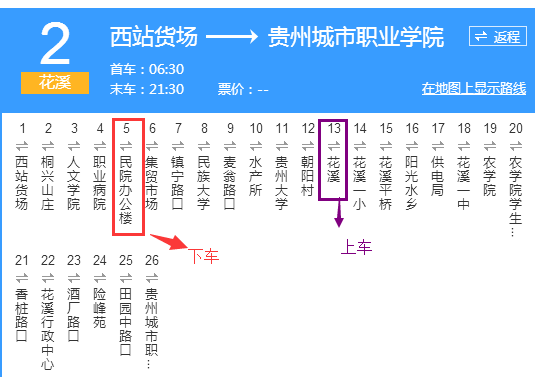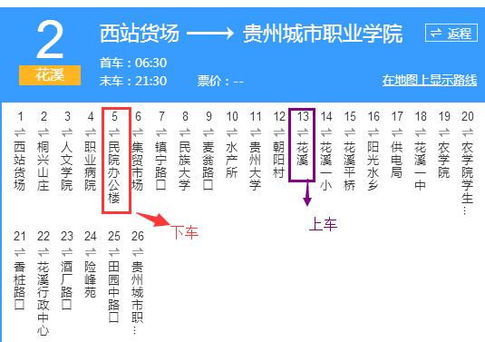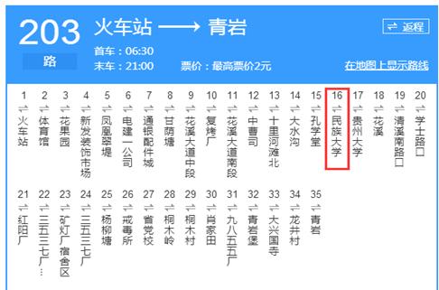 (二)公交路线: 1. 贵阳火车站:到站台乘坐203路公交车,到贵州民族大学站下车。