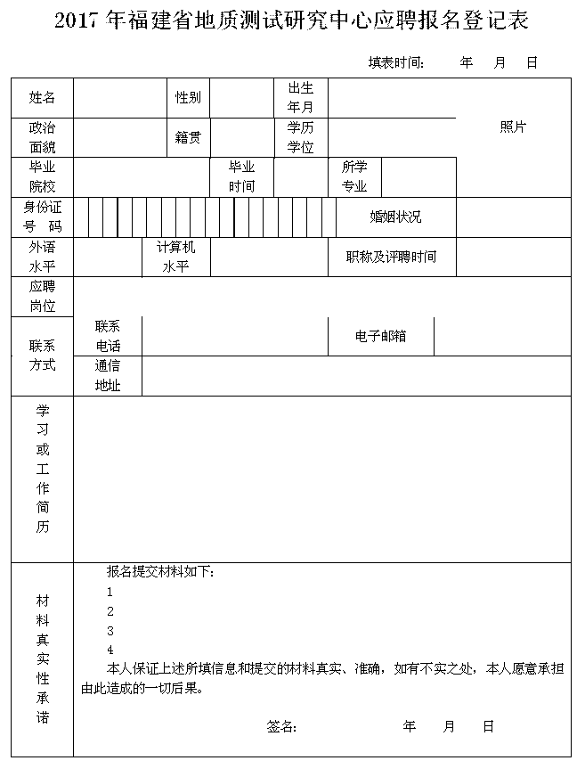 (1)《福建省地质测试研究中心应聘报名登记表》;