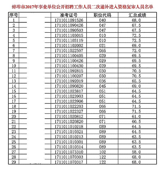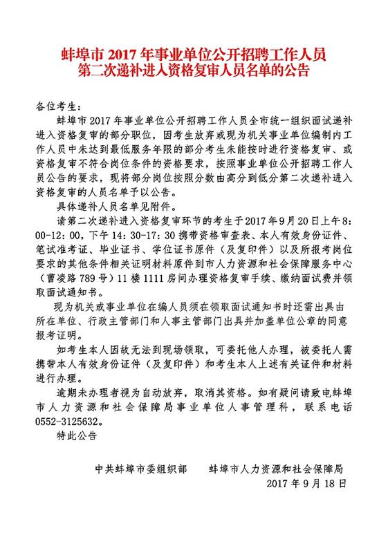 2017蚌埠市事业单位公开招聘工作人员第二次递补进入资格复审人员名单的公告.docx