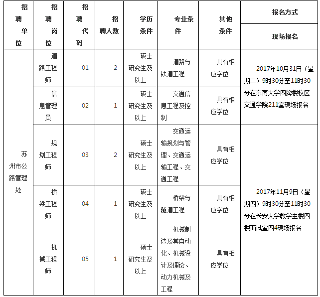 苏州市公路管理处公开招聘2018年应届高层次紧缺专业毕业研究生岗位表