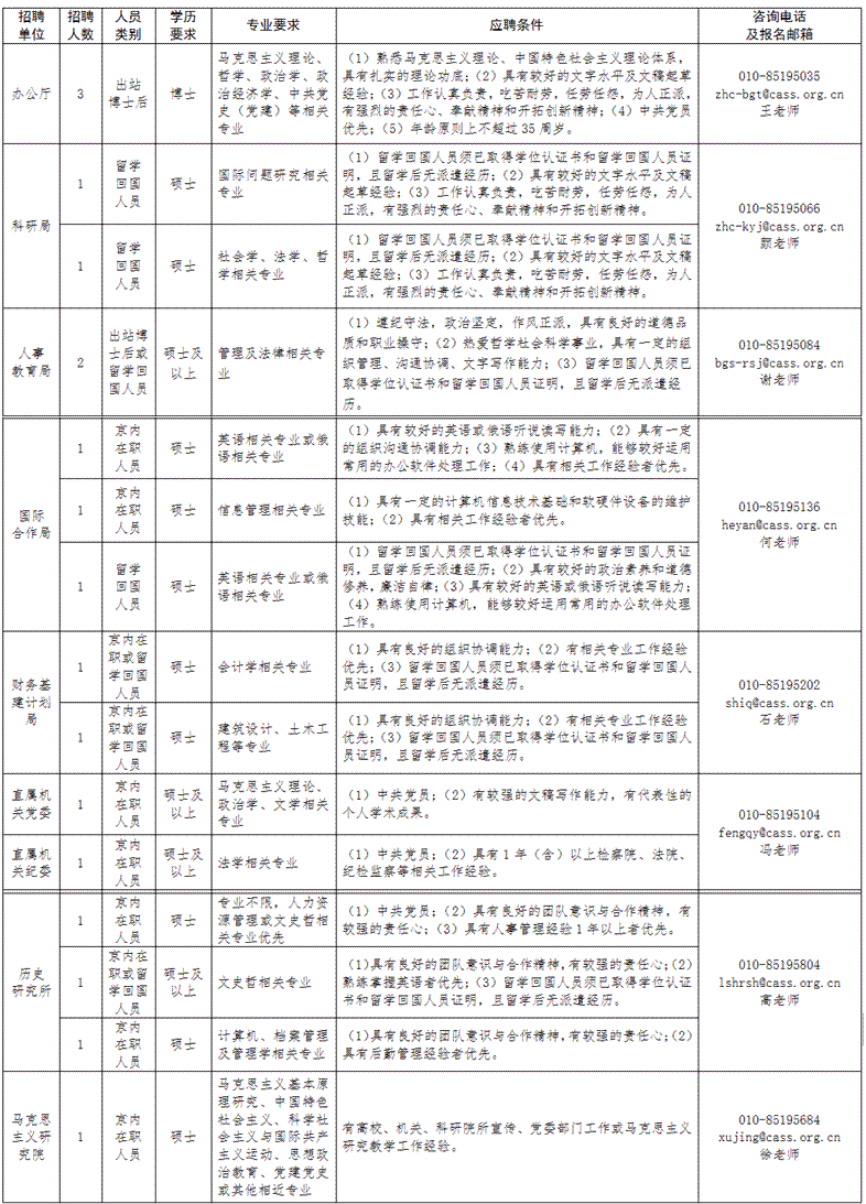各招聘单位的拟招聘人数、具体职位、资格条件等详见《中国社会科学院招聘管理人员岗位信息一览表》(见附件1)。如对专业、学历、学位、资格条件等内容需要咨询时,请与相关招聘单位联系。