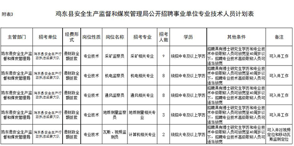 具体招聘岗位、招聘条件等详见附表1:《鸡东县安全生产监督和煤炭管理局公开招聘事业单位专业技术人员计划表》