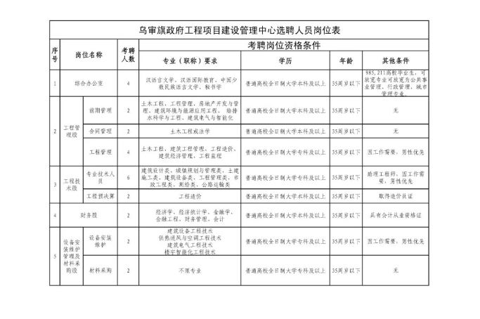 乌审旗政府工程项目建设管理中心公开考聘工作人员职位表和报名表.doc