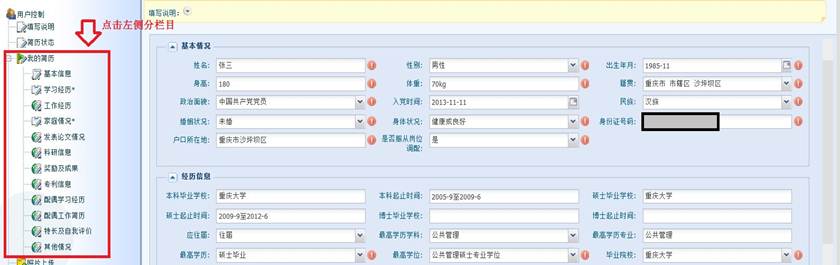 2.逐项填写“我的简历”中的相关栏目 除“必填栏目”以外,请尽量完整填写能反映个人学习、工作、能力方面的栏目。点击左侧“我的简历”下方的各个分栏目,填写相关信息。其它非相关栏目不需填写。