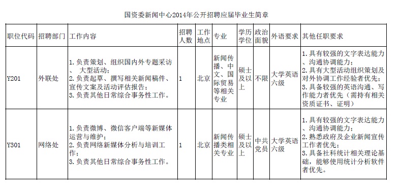 招聘职位相关信息及任职资格要求详见附表《国资委新闻中心2014年公开招聘应届毕业生简章》(附件)。
