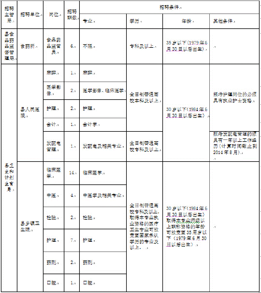1、报名时间及方式:本次报名主要采取现场报名的方式进行,报名时间为2014年8月11日 (上午8:00至11:30,下午3:00至5:30)。报名时请携带本人毕业证、《教育部学历证书电子注册备案表》、资格证、有效身份证原件和复印件各一份(有工作经历要求的还需提供相关单位证明),近期彩色免冠1寸登记照片2张和报名费100元到县人力资源和社会保障局二楼招聘大厅报名。