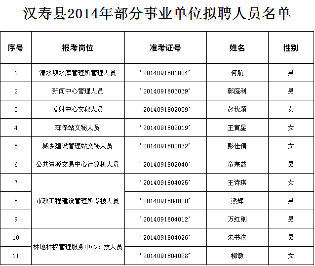 原标题:关于汉寿县2014年部分事业单位拟聘人员名单的公示