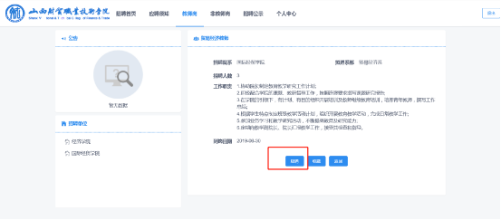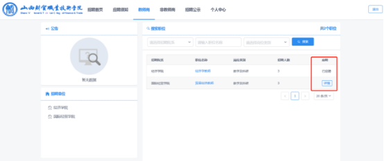4、然后在下图界面选择需要应聘的岗位,然后点击详情,最后点击“应聘”按钮就完成了简历投递(每人限报一个岗位)。