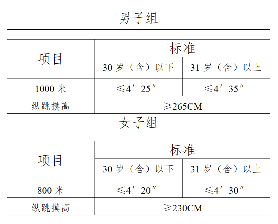 体测项目为纵跳摸高和1000米(男)或800米(女)长跑,相关标准参照《公安机关录用人民警察体能测评项目和标准(暂行)》。体能测试有一项不合格的,取消进入下一环节资格。