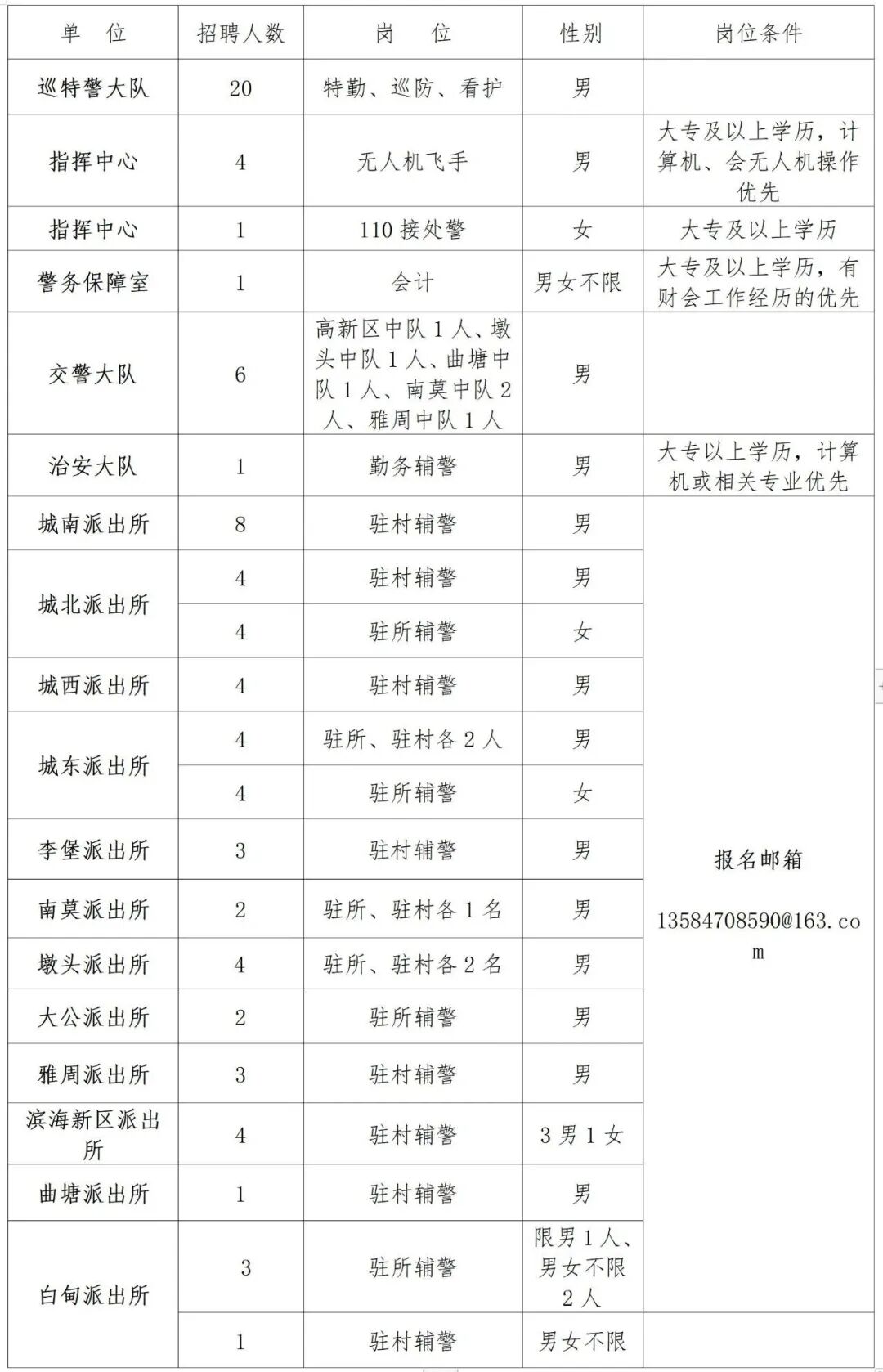 2.网上报名:报交警铁骑、交警路勤、车管所、指挥中心、网络安全大队人员将警务辅辅助人员报名登记表、身份证照片、毕业证书、个人征信报告电子档发至电子邮箱525090431@qq.com,报派出所岗位人员将警务辅助人员报名登记表、身份证照片、毕业证书、个人征信报告电子档发至电子邮箱13584708590@163.com,并务必注明意向应聘岗位(请仔细阅读各招聘岗位的性别、年龄要求和岗位条件)。
