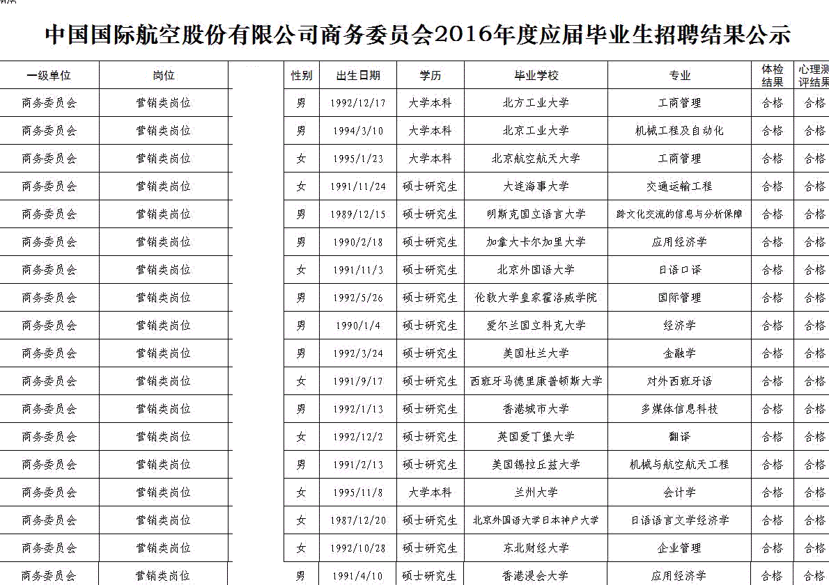 安徽:2016年07月国航股份商务委员会应届毕业生招聘结果公示