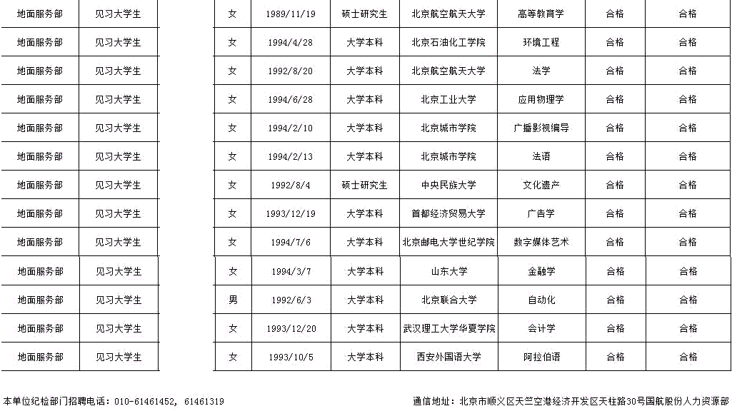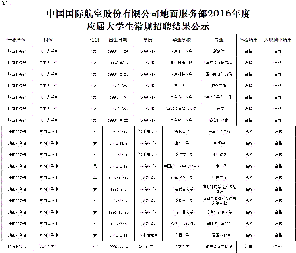 浙江:2016年07月国航股份地面服务部应届毕业生招聘结果公示