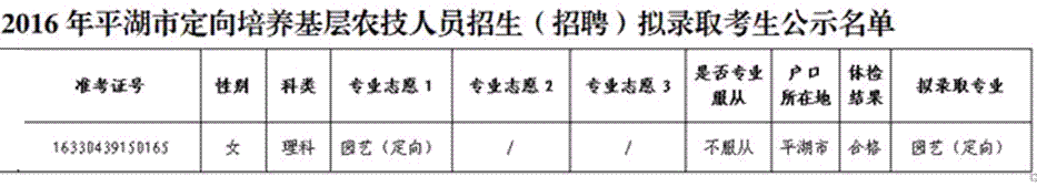 2016年度平湖市定向培养基层农技人员招生(招聘)拟录取考生公示名单