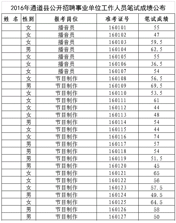 湖南:2016年08月怀化通道县事业单位招聘笔试成绩