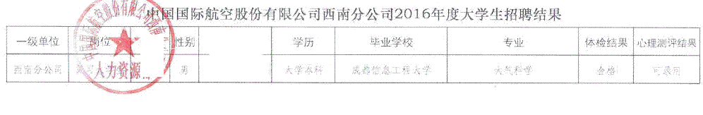 辽宁:2016年08月国航股份西南分公司应届毕业生招聘结果公示(二)