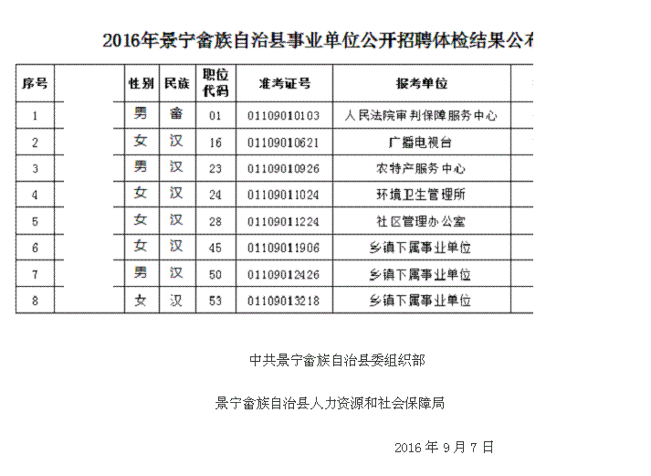 浙江:2016年09月浙江景宁畲族自治县事业单位招聘体检结果公布(二)
