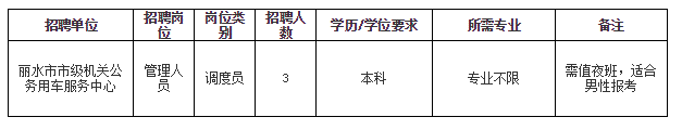 根据《浙江省事业单位公开招聘暂行办法》有关规定,丽水市机关事务管理局下属事业单位丽水市市级机关公务用车服务中心面向社会招聘管理人员3名,现将具体事项公告如下: