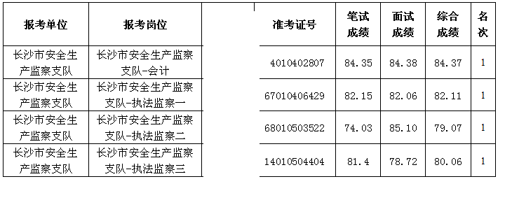 长沙市安全生产监督管理局所属事业单位公开招聘,经报名、资格初审、笔试、资格复审、面试等程序,以下4人进入体检,现公示如下。