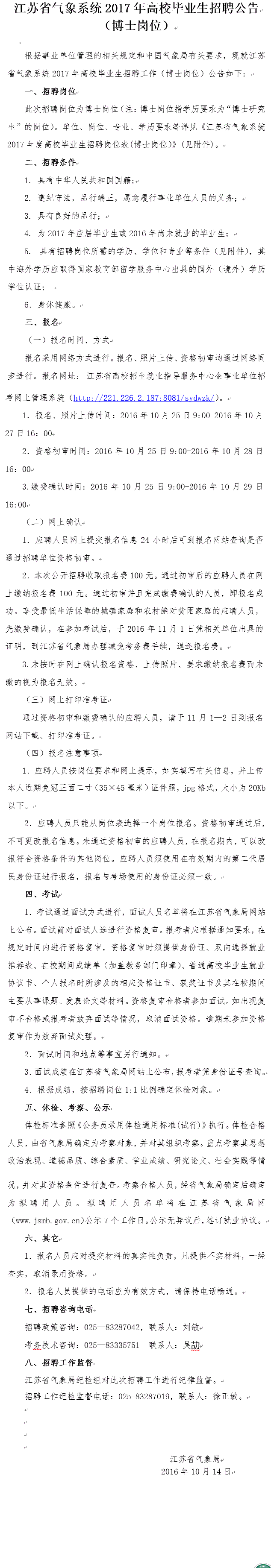 2017年江苏省气象系统高校毕业生招聘公告(博士岗位).xls
