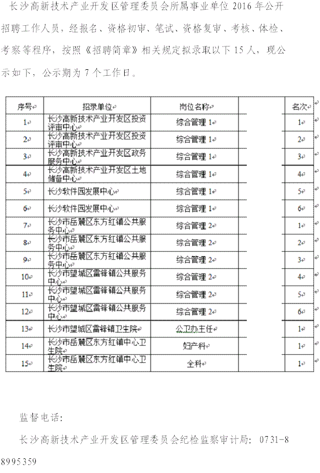 长沙高新技术产业开发区管理委员会所属事业单位2016年公开招聘工作人员,经报名、资格初审、笔试、资格复审、考核、体检、考察等程序,按照《招聘公告》相关规定拟录取以下15人,现公示如下,公示期为7个工作日。