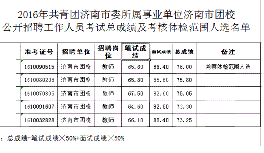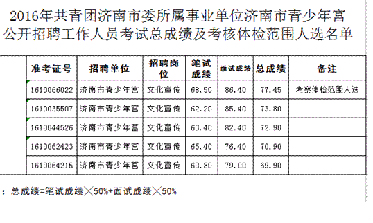 原标题:2016年共青团济南市委所属事业单位济南市青少年宫公开招聘总成绩及考察体检范围人选公告