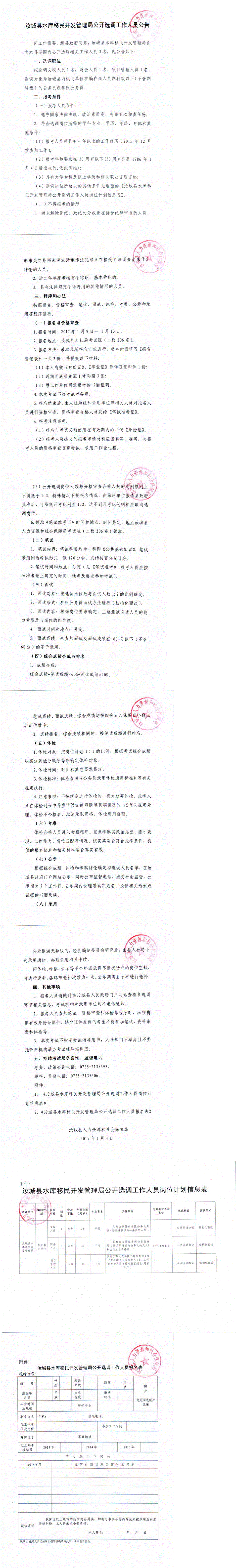 湖南:2017年01月2017湖南汝城县水库移民开发管理局选调3人公告