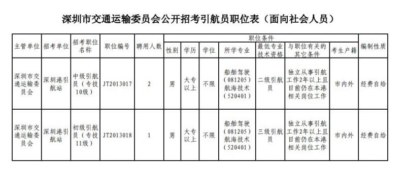 根据《深圳市事业单位常设岗位工作人员招聘办法》(深人社规〔2012〕16号)有关规定,经市人力资源和社会保障局核准,我委决定公开招聘3名引航员,具体职位参见《深圳市交通运输委员会公开招聘引航员职位表》(见附件1,以下简称《职位表》),现就有关事项公告如下: