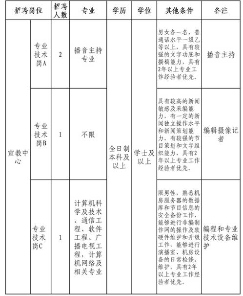 5.专业技术岗A人选要求出生日期在1990年1月1日之后,其他岗位人选要求出生日期在1985年1月1日之后,在市级以上媒体有3年以上工作经历的优秀人才,报考条件可适当放宽。