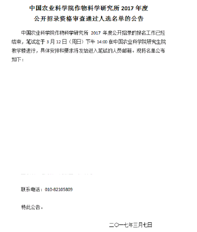 天津:2017年03月中国农业科学院作物科学研究所招录资格审查名单公告