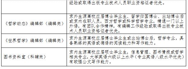 中国社科院哲学研究所根据本所学科建设和人才队伍建设的需要,2017年拟面向国内外知名高校和研究机构公开招聘6名专业技术人才,招聘类型和名额包括京内生源高校应届硕士毕业生1名,京外生源高校应届博士毕业生1名,留学归国博士、出站博士后以及京内在职从事相关专业研究的高层次人才共4名。具体招聘条件和要求如下: