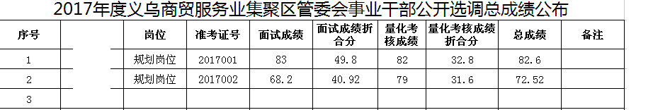 浙江:2017年03月浙江义乌商贸服务业集聚区管委会事业干部选调总成绩公告