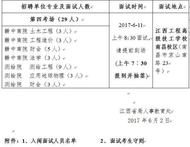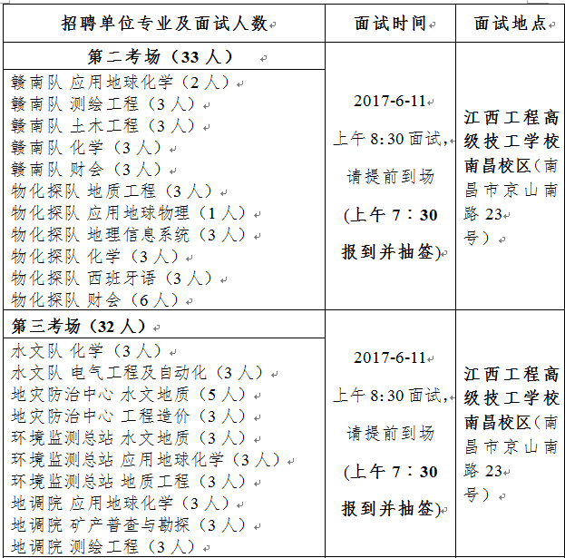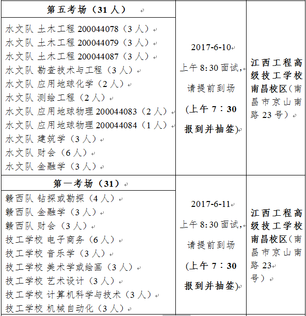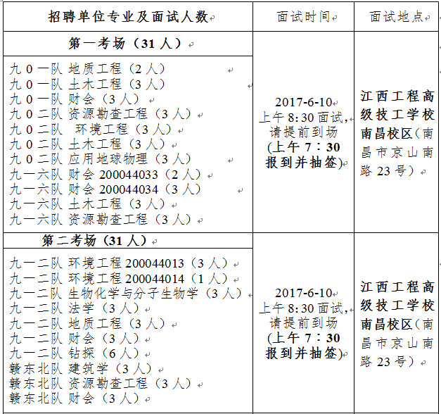 1、面试时间、地点:6月10日—11日两天,地点为江西工程高级技工学校南昌校区(原省地矿局教育中心,院内有食堂及宾馆住宿)。